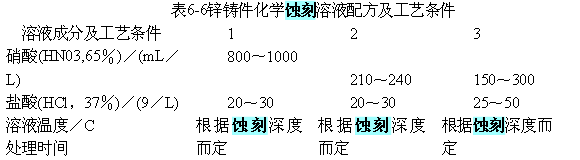 蝕刻不同的金屬要采用不同的溶液配方及工藝條件,常用金屬材料的蝕刻溶液配方及工藝條件見表6—4~表6-6。
