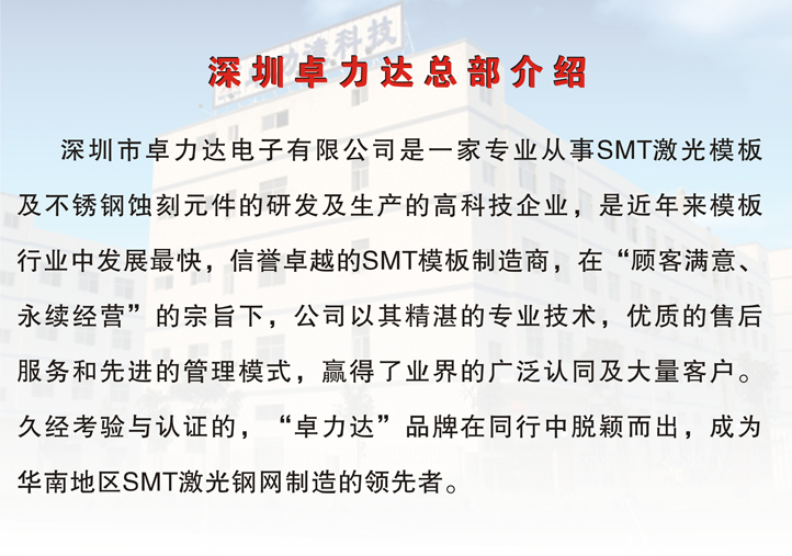 深圳市卓力達(dá)電子有限公司是成立于1999年,卓力達(dá)人專注于不銹鋼精密蝕刻元件和SMT激光模板的高端技術(shù)研發(fā)和工藝創(chuàng)新及生產(chǎn),最近年來蝕刻行業(yè)中迅猛的發(fā)展,信譽(yù)卓越的SMT模板制造商,在“顧客滿意、永續(xù)經(jīng)營”的宗旨下,公司以其精湛的專業(yè)技術(shù),優(yōu)質(zhì)的售后服務(wù)和先進(jìn)的管理模式,贏得了業(yè)界的廣泛認(rèn)同及大量客戶。久經(jīng)考驗(yàn)與認(rèn)證的,“卓力達(dá)”品牌在同行中脫穎而出,成為華南地區(qū)SMT激光鋼網(wǎng)制造的領(lǐng)先者。